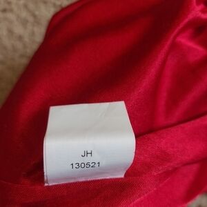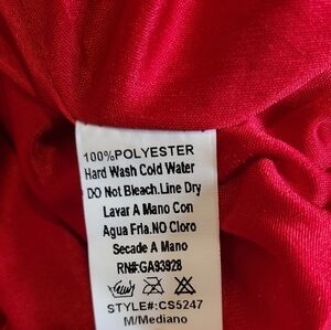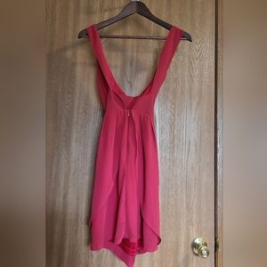 Maude v-neck cocktail mini dress in the color red, size medium. Features: Flowy sheer layers, lined, and a zip closure. In excellent preloved condition. 100% polyester.