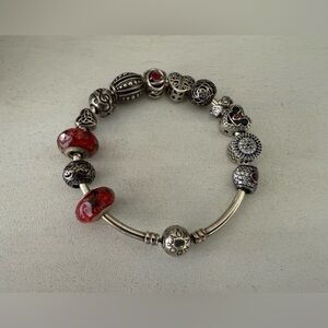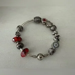 The 5 Charms on the left side with the wavy fancy pink beads and the mini silver heart along with the scrolly silver detailed balls those are all marked 925 a couple may be pre 2011 Pandora but they are sterling silver just not sure if those are Pandora beads but look so good with the rest of the Pandora Authentic beads - All 100% Sterling and marked