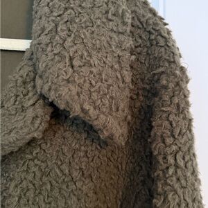 Warm olive teddy jacket with button closure.