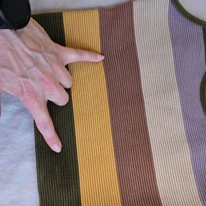 Green trim and stripe, with mauve, pastel purple, orange, multicolor stripe.