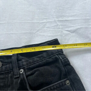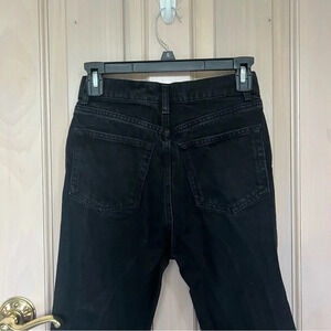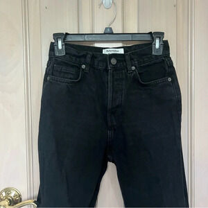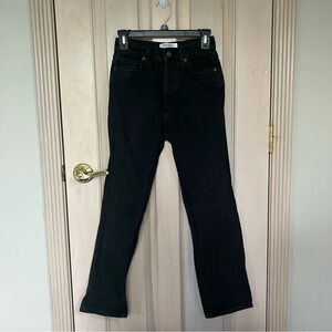 These Reformation jeans are designed to be fitted in the waist, butt, and hips with a straight leg. In washed black denim.