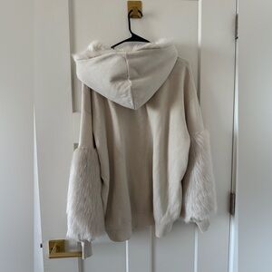 Chic cream sweater with plush faux fur hood and sleeves. Ideal for cozy outings.