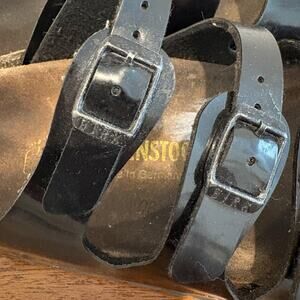 Upper: Glossy Birko-Flor patent with three adjustable buckle straps (buckles embossed BIRKENSTOCK)