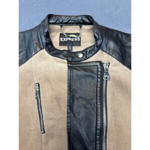 Express Two Toned Beige and Black Leather Full Zip Blazer Jacket Poly Women Med