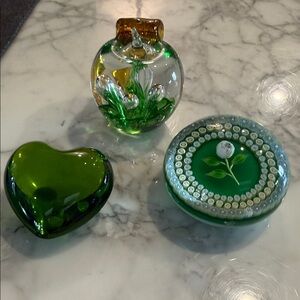 The heart and the flowers is both by Bacharach. The apple is a Scotland artist author throw a paper weights. The flower Bacharach has some defects in it, but the price is priced accordingly.