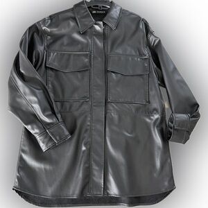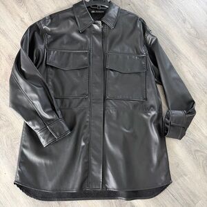 Stylish black faux leather shirt jacket by Zara. Features front pockets and button closure. Ideal for layering.