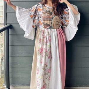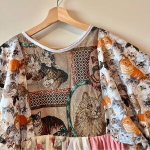 This dress is handcrafted from a curated blend of thoughtfully sourced materials, featuring playful cat prints throughout. The bodice is made from a repurposed vintage coat, while the wide, dramatic ruffled sleeves are crafted from brand-new Joann deadstock fabric. The piece combines both new and vintage textiles for a truly one-of-a-kind look. Soft to the touch with a comfortable pull-on design, it offers a relaxed, easygoing fit. Made from 100% cotton and partially lined.