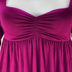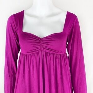 Brand new with tags. A beautiful vibrant purplish Pink color. Lotsa ruching at the neck line and waist. Deep wide sexy square neck line. Extremely soft Comfortable fabric. A slight hi/ low dress.