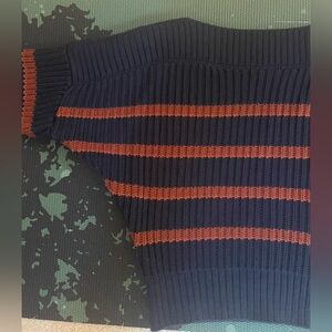 Banana Republic Boatneck Button Shoulder Striped Sweater Navy & Brown Sz Med. Extra room in the chest and shoulder about 29" across for a batwing or dolman sleeve look then tapers to the waist about 14"W (not stretched) x 21.5”L. 100% organic cotton. Nicely weighted, high-quality material. Flattering, boho vibes, warm and cozy too. EUC, like new.