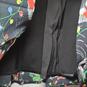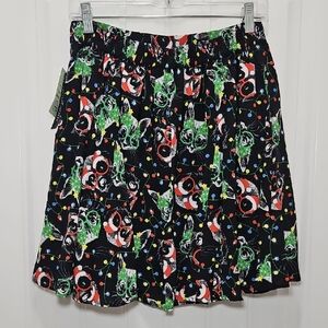 Quirky Christmas skirt featuring cats (and dogs) wearing festive glasses tangled in Christmas lights. Known for its skater style, pockets, and fun print. Retired ModCloth design. It's a pleated mini skater skirt with an elastic waist, fully lined and designed to be a whimsical holiday piece.