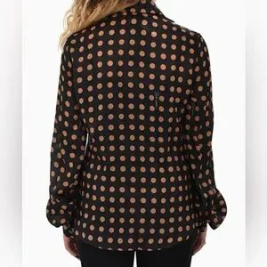 Stylish polka dot blouse with ruffle details. Perfect for versatile wear.