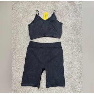NWT Daisy two-piece ribbed workout set in black/dark grey. Includes a matching bra and biker shorts. Comfortable, stretchy, and perfect for workouts, yoga, or lounging.
