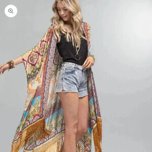 New Boho Ruggine Bohemian Jacquard Print Kimono Coverup Wrap with fringe hem.