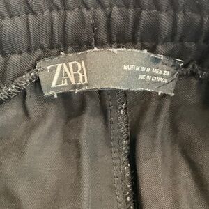 Stylish and comfortable black cargo pants. Perfect for everyday wear. Drawstring and zipper with button. Elastic fitted at ankles.