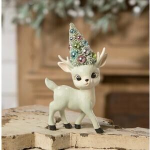 New Bethany Lowe set of 2 pastel reindeer with bottle brush trees decorated in shiny Christmas bulbs on top of their heads. Includes one pink and one aqua reindeer.