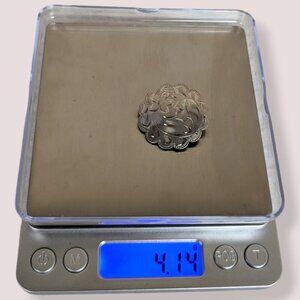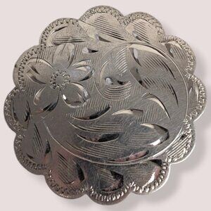 This vintage brooch by Ladye Fayre is made of sterling silver and has a modern locking c pin closure. The brooch is round with scalloped edges and has a swirly floral design etched into its face. The back is stamped Ladye Fayre Ster at the bottom. The brooch has wear throughout, please have a look at the pictures.