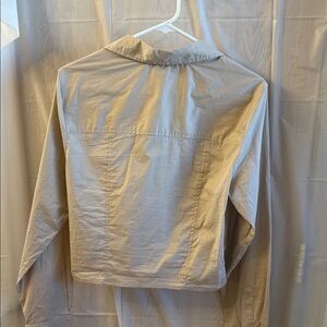 Chic beige button-down with a twist front. Perfect for versatile styling.