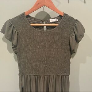 This Hount olive green maxi dress is perfect for any occasion. It has an empire waist and pockets! Its flowing design and pretty detail offer both comfort and style. It would look so cute with sandals and a cropped jacket. Good used condition.