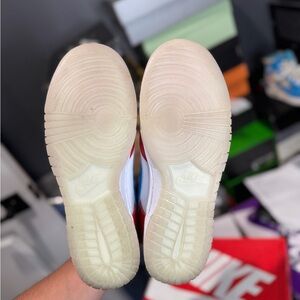 Colorful Nike sneakers for kids. Red, blue, and yellow design. Perfect for active play.
