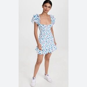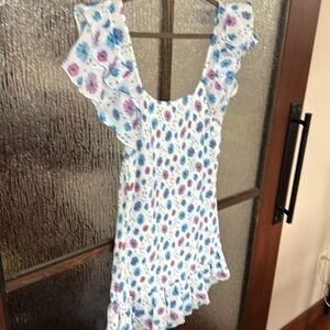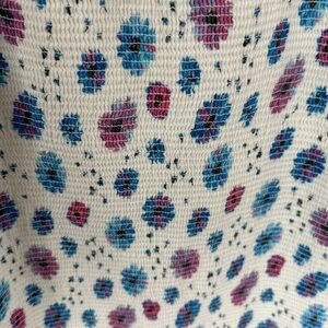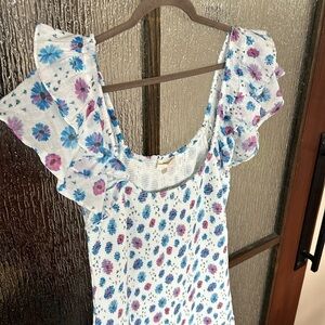 Blue printed cotton (100% Cotton). Sheath. Square neck. Short sleeves. Pull-on. 35” from shoulder to hemline. Imported.