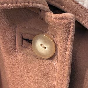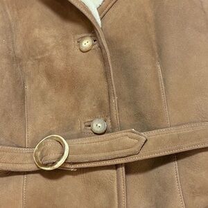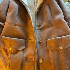 Stay warm and stylish with this tan shearling coat. Perfect for any occasion.