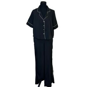 Jason Wu Black Pajama Set Women’s L Short Sleeve Button Top Pants White Piping