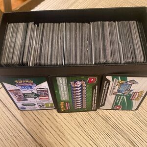 Pokemon Live Code Cards for online playing. These cards are from all different sets. Scarlett Violet, Paldea, Brillant Stars, Shining Fates, Fusion Strike, Obsidian Flames, Evolving Skies, Crown Zenith, Vivid Voltage, 151, Silver Tempst, Lost Origins, Masquerade
