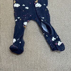 Adorable navy footie with pink accents. Features cute cloud and moon design. Perfect for cozy nights.