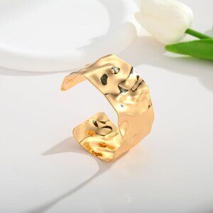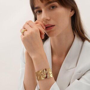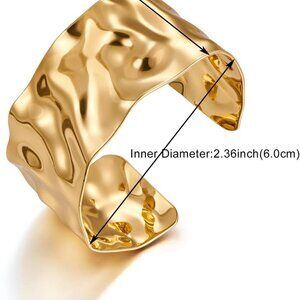 Features: Unique irregular hammered texture gives this bracelet a vintage, artisan vibe. The wide, open cuff shape is adjustable and flexible, so it'll fit comfortably on most wrists. Hand-polished for a glossy, smooth finish, making it super comfortable to wear all day. A bold statement piece that can be worn alone or stacked with other jewelry for a layered look.