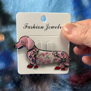 Measures approximately 3 inches by 1 and a half inches Add a playful touch to your outfit with this charming pink dachshund brooch. Perfect for dog lovers, this brooch features intricate floral details and vibrant colors. A delightful accessory for any occasion.