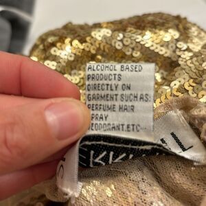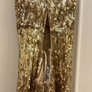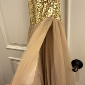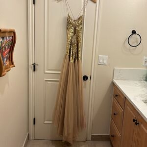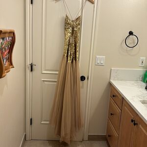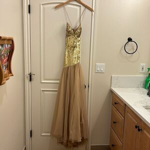 Sherri Hill woman's gorgeous gold beaded with nude lace at the bottom dress