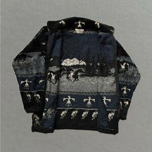 Vintage 90’s Black Mountain Outdoor Western Mountains Zip Up Fleece Jacket. Size S. In good condition. No stains. Super soft zip up fleece with a western themed design including mountains, horses, and Kokopelli. Two exterior pockets. Zipper does have some wear but otherwise fleece is in good condition. Blue, black, brown, and white in color.