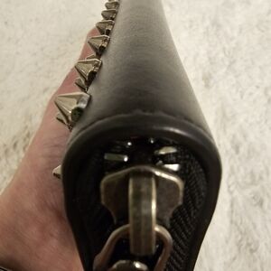 Stylish black wallet with iconic Christian Louboutin studded design and red interior. Perfect for a bold look.