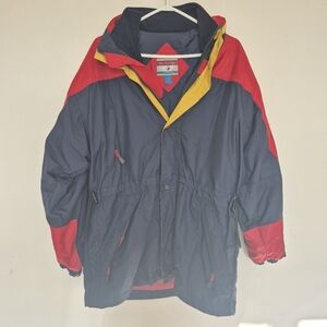 Tags: snowridge, vintage ski jacket, colorblock jacket, 3 in 1 jacket, 90s fashion, 80s retro, winter parka, snowboarding coat, neon ski wear, trimark, primary colors, tech nylon, gorpcore, mountain gear, fleece lined, winter essentials