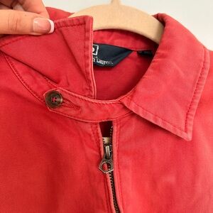 Stylish red jacket by Ralph Lauren. Lightweight and perfect for layering. Features a classic collar and zip closure.