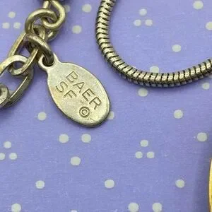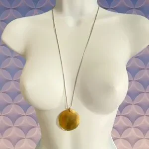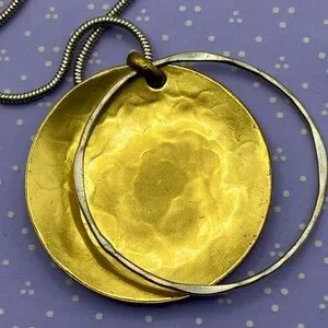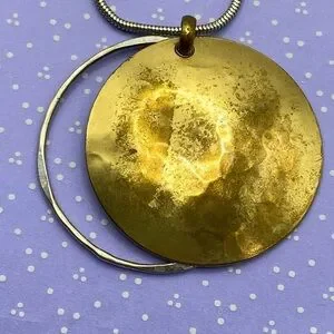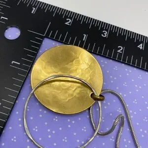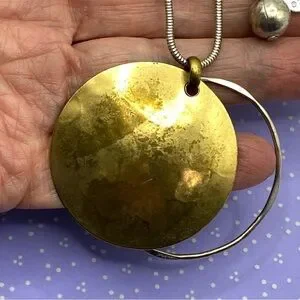 BAER SF Marjorie Baer Mixed Metals Long Necklace. Hammered Brass Disc with silver tone hoop may be worn in either direction. Disc pendant measures approx 1.5' on chain which measures approx 28"+4" extender chain. Has BAER SF hang tag and large silvertone bead on end of extender chain. Nice necklace shows some normal wear with convex side of disc showing discoloration. #24