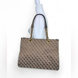 An everyday bag, elevated. This faux-leather tote features a logo-printed jacquard exterior with belted logo hardware and mixed-material shoulder straps.
