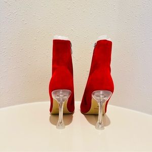 Absolutely gorgeous and trendy sexy red suede heel booties/Zipper closure/ Sculpted Lucite Heel/Pointed toe