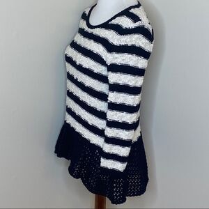 Black & white long sleeve black & white striped textured sweater with 3/4 length sleeves. Black peplum flounce crochet hemline.
