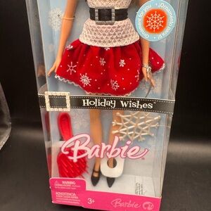 This is the Holiday Wishes Barbie doll from 2007. The doll comes in a festive red and white outfit with a faux fur collar and includes a snowflake-shaped ornament.