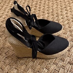 Elegant black espadrilles with wedge heel. Features comfortable ankle ties. Perfect for any occasion. Black canvas braided jute wedge heel. 3.75” wedge, .75” platform front. Good gently used condition.
