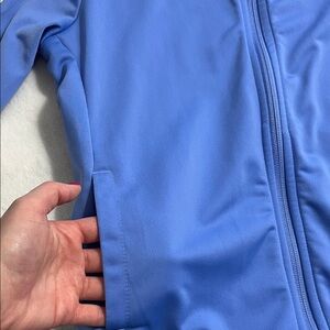 Light blue jacket with iconic white stripes. Adidas logo on front.