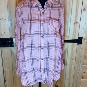 Free People No Limits Oversized Linen Plaid Button Down Shirt Salmon Peach XS