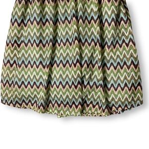 Features a gathered pleat waist, hand pockets, 70's inspired chevron printed woven overlay and cotton lining and back zip entry.