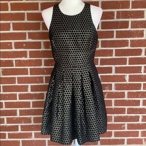 Crisp yet lightweight fabric of polyester, acrylic, and metallic. Dress is solid black dots on a gold metallic background. Fully lined.Deep cut armholes. Fitted waist with box pleats below. EUC bust 37” waist 28” length 34.5”