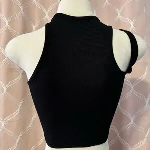 Stylish black crop top with a unique cutout design. Perfect for casual outings or a night out.