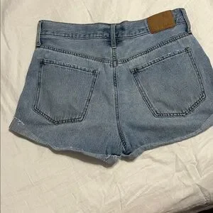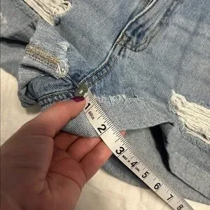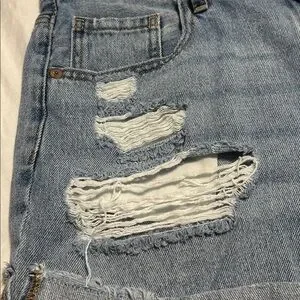 Trendy distressed jean shorts. Light blue wash. Perfect for casual wear.