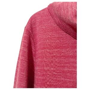 Duluth red feathered Deux More soft and stretchy double knit cowl neck tunic with a dual entry kangaroo pocket.