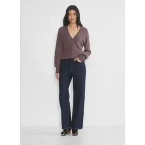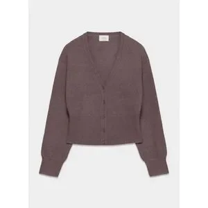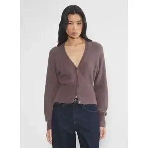This is a fully fashioned V-neck cardigan with an emphasized waist and ribbed trim. It's knit with soft-brushed, spongey yarn with hint of merino wool and cashmere for a cozy feel. It's constructed with a Jersey stitch for a soft drape and a smooth, flat feel.