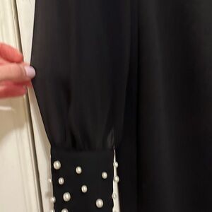 Chic black dress with elegant pearl cuffs. Perfect for formal events. Sophisticated and stylish.